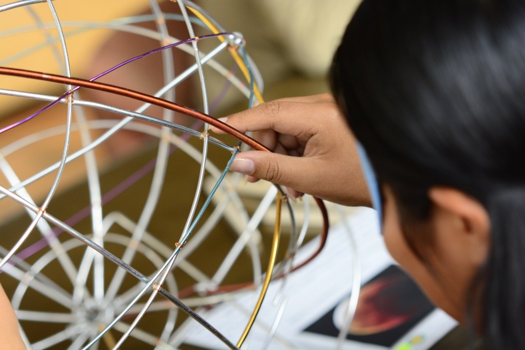 Cuando Lorena siente con sus manos la suave textura del algodón de azúcar, su imaginación la lleva a reconocer un fascinante lugar en el universo donde nacen estrellas: una nebulosa (así se denominan estos lugares de formación de brillantes soles como el nuestro). Lorena inmediatamente después toma una sombrilla que despliega impacientemente sobre su cabeza para comenzar a palpar la tela de la cual está hecha. Puede notar sus texturas en alto relieve que simulan la bóveda celeste; estas la llevan a tocar el cielo con sus manos, indagando sobre la posición de las estrellas en el firmamento. Allí se encuentra con las diversas constelaciones que durante miles de años han maravillado a los seres humanos.