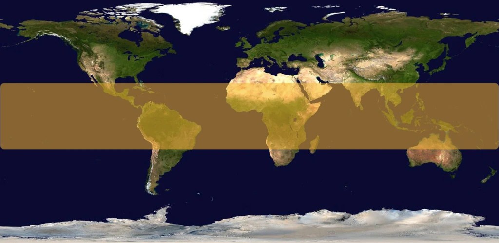 SI nos encontramos fuera de la zona intertropical, y como consecuencia de la inclinación del eje de rotación de la Tierra (23.5º), el Sol nunca podrá ser visto justo sobre nuestras cabezas, y en estas regiones el Sol siempre impactará de manera oblicua.