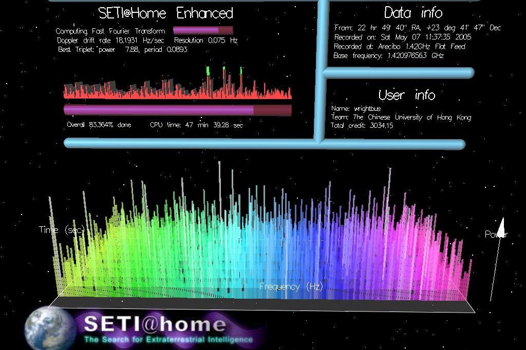 El que mas recuerdo es sin duda aquel que aprovechaba los recursos de la máquina, cuando no se encontraba en uso, para realizar una loable labor, la búsqueda de señales de vida inteligente fuera de nuestro planeta. La idea, parte del proyecto denominado SETI@home, me parecía fascinante y pensaba en las consecuencias de que alguna de las millones de personas, y sus diligentes computadores, pudieran encontrar una señal de comunicación interplanetaria.