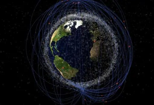 Millones y millones de diminutas agujas flotan como nubes alrededor de un planeta, formando un paisaje espacial único. La compleja estructura es parte de un sistema de comunicación, y funciona como una capa en donde se reflejan las señales para transmitirse de un lugar a otro sobre la superficie del planeta.